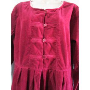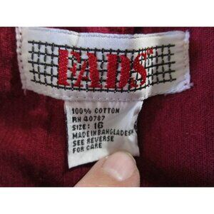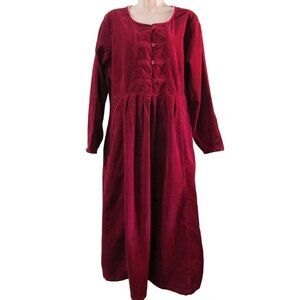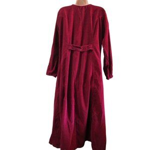 Modest, vintage burgundy maroon corduroy dress featuring long sleeves and delicate lace trim at the neck. Sized for women, in excellent used condition. By FADS. Ladies 16. 100% Cotton. Made in Bangladesh. Lace trim at neckline is pink. Button placket at chest with pleats falling from that. Long sleeve with button cuffs. Two adjustable button tabs at back waist.