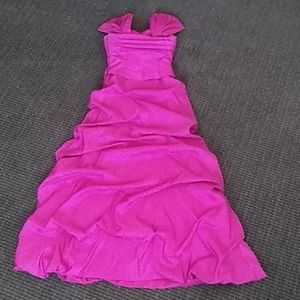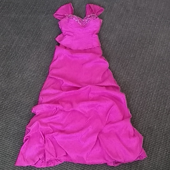Beautiful HOT Pink modest Prom dress. Beautiful sequins on bodice. Ruched A-line. Some ruching tacks are missing on front. Built in bra. Fun side zipper! Looks like a two piece but is one dress.