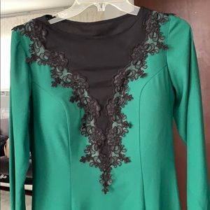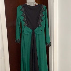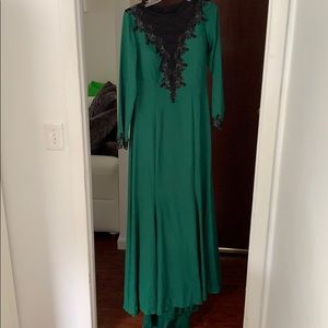 Very Modest emerald green dress- has a built in bra- has a train. Gorgeous dress - from europe- sizing is 8