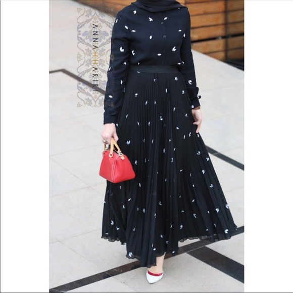 Hijab friendly top and maxi skirt set. Black with white polka dots.
