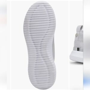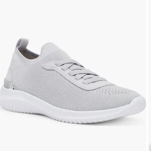Stylish gray knit sneakers featuring a sleek silver accent. Perfect for casual wear.