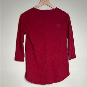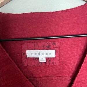 This mododoc blouse in a vibrant red hue features a relaxed fit and a soft knit texture, perfect for a comfortable yet stylish look. The V-neck design and gently curved hemline add a touch of elegance to this versatile top. Ideal for casual outings, it offers a flattering drape and a consistent color throughout.