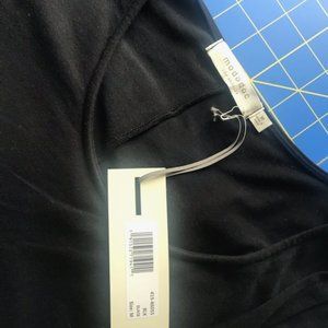 Adorable short sleeved crossover front knit dress color Black dress looks like a wrap dress but is sewn at the side - no worries about wardrobe malfunctions! It has a scoop neck. Fabric is 54% cotton, 44% modal, %2% spandex. It is drapey and lightweight.