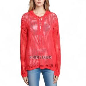 Add a vibrant touch to your wardrobe with this Mododoc Pointelle Open Stitch Hooded Lace-Up Sweater in neon coral, size M. Crafted from a lightweight open-knit fabric, this sweater features a relaxed fit, long sleeves, and a lace-up neckline, making it perfect for layering during transitional seasons.