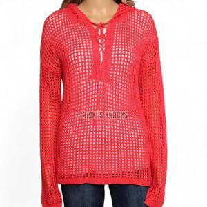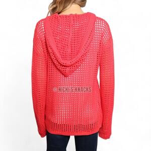 Mododoc Pointelle Open Stitch Hooded Lace-Up Sweater Neon Coral Size M