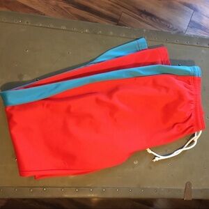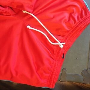 Bright tie waist comfy joggers. Red/Orange color with blue stripe. Great for casual day. Gently preowned condition. See photo for material details