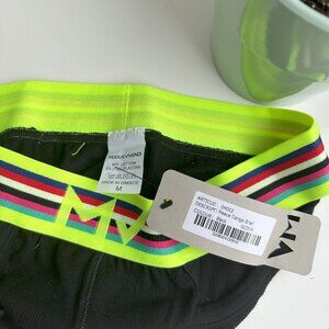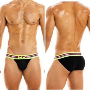MODUS VIVENDI's design of the Peace line was inspired by the rainbow flag colors to color your world. The colors representing freedom of being and Love. A retro favorite design with a modern palette and updated silhouettes are serving the need for a statement. These briefs are a low rise style with a multi color striped knitted waistband.