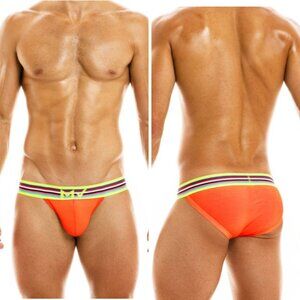 MODUS VIVENDI's design of the Peace line was inspired by the rainbow flag colors to color your world. The colors representing freedom of being and Love. A retro favorite design with a modern palette and updated silhouettes are serving the need for a statement. These briefs are a low rise style with a multi color striped knitted waistband.