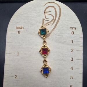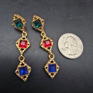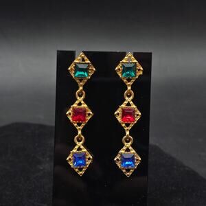 These vintage earrings feature red, green and blue rhinestones and measure 2.25" x .5" W