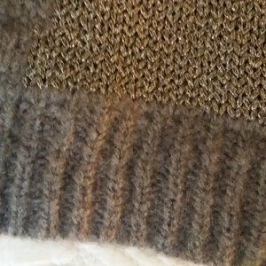 NWOT- Mohair blend sweater, purchased in Italy, never worn. Size Small. The sweater measures (front) from collar to hem 20", from back collar to hem 22". It's almost a cropped length, depending on the wearer. It has dropped shoulders. The colors are almost bronze/olive metallic with gray/lavender soft accents. The back of the sweater is a crochet-like weave, the front is solid. The pattern on the front is in the shape of an "A". The fabric is 35% mohair, 35% acrylic, 30% polyamide. It has been stored in a sweater bag since purchase.