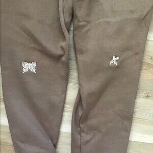 Signature on leg, graphic on hip, embroidered bee and butterfly on back of calf