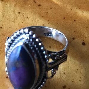 This boho style ring is made with purple Mojave turquoise. Mojave turquoise is real turquoise from Kingman mine that has been infused with minerals, such as copper, and then stabilized and color enhanced. The ring is set in solid .925 sterling silver, and it has beautiful filigree work on the side of the band. Perfect for everyday use. The ring in the photos is the one you will receive, so please see photos for stone quality and measurements. Size 5.