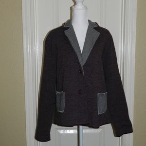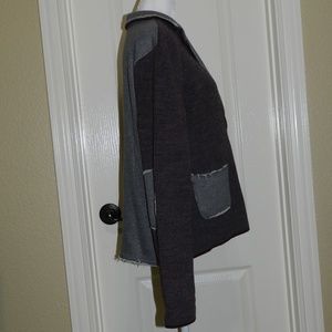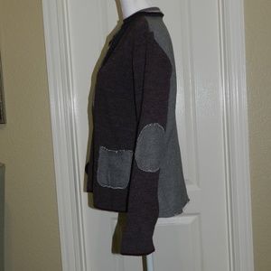 Burgandy and Gray Knit with fringe pockets, hem and patches.
