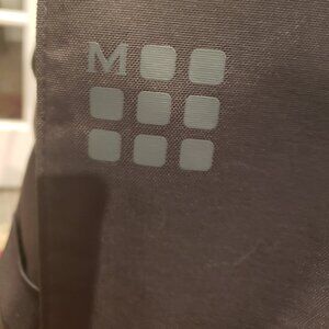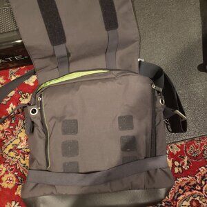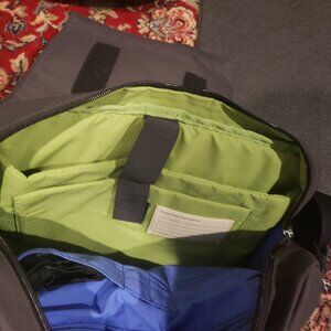 Black with Blue and Green Interior Messenger/Backpack from Moleskine. Shoulder strap, id tag, storage bag that hooks inside, backpack straps that can also be hidden, and many padded compartments. Lighted used.