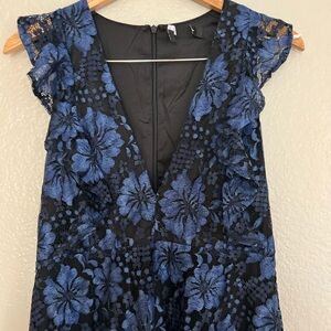 Lulus Exclusive! Take a twirl and turn some heads in the Lulus Molinetto Navy Blue Lace Ruffled Tiered Sleeveless Maxi Dress! Lovely floral lace, over a contrasting black woven lining, falls from a plunging V-neckline, into a ruffled sleeveless bodice. High, fitted waist sits above an elegant tiered maxi skirt. Hidden back zipper/clasp.