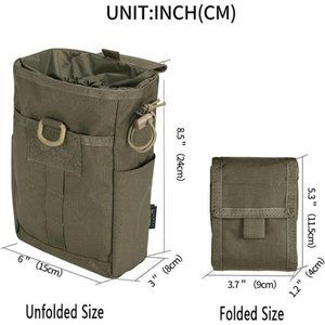 * These foldable molle dump pouches are specially made for functionality and convenience with a drain hole at the bottom. Easy to be added to a belt, tactical backpack, or tactical vest or to any Molle-webbed vest.(Unfolded Size: 6'' x 3'' x 8.5''(L*W*H) / Folded Size: 3.7'' x 1.2'' x 5.3''(L*W*H)).