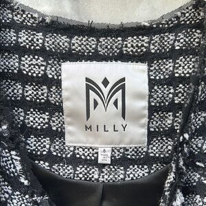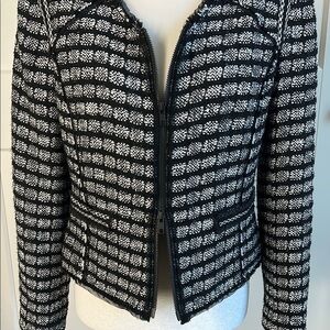 Elevate your style with this chic black and white tweed jacket. Perfect for any occasion, this jacket offers a sophisticated look with its classic design.