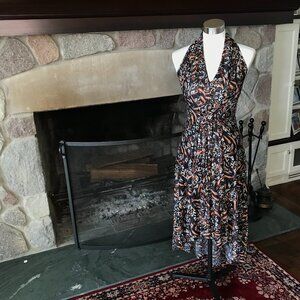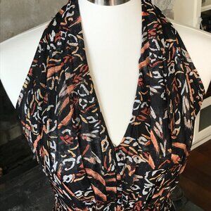 This item is has never been worn with original tags still attached. It is a halter black fauve dress with orange and white patterns. The skirt in the front is slightly shorter in the front and longer in the back. There is a tie in the front to cinch the fabric making it hug at the waist.