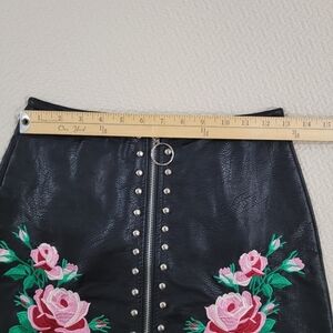 Molly Green Black Faux Leather Floral Embroidery Skirt Studs Zipper Front Size S