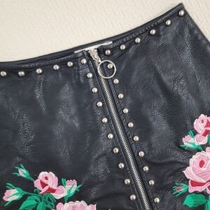 Black faux leather mini skirt with floral embroidery. Studding details. Full front zipper with ring pull.