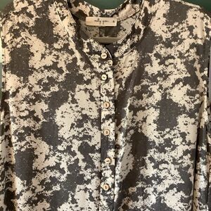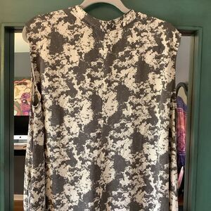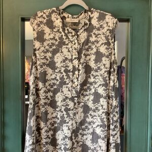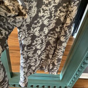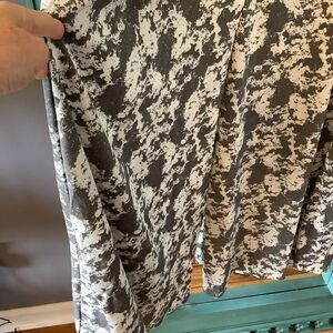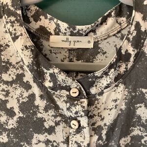 Nicely designed, wide-leg, jumpsuit with pockets from Nashville Designers, Molly Green. Love the artsy, gray and white patterned fabric. Very comfy and freestyle. Add a contrasting g belt to add shape. Size medium.