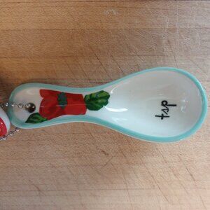 Retired ceramic measuring spoons on a beaded chain. Cute floral pattern Molly Hatch Measuring Spoons. They are used previously but are fully operational and function as intended. In very good condition. There are a few tiny bumps under the paint and glaze from the manufacturer. These are rustic in design. Super cute! Please see all photos for condition and feel free to ask questions.