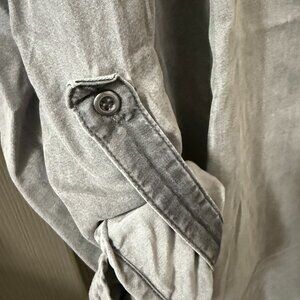 Classic and versatile button-up shirt by Molly & Isadora in a washed gray with a soft denim (chambray-like) feel. Designed with a collared neckline, button front closure, dual chest flap pockets, and long sleeves that can be worn down or rolled up and secured with button tabs. Lightweight yet durable fabric makes it perfect to wear on its own, layered, or open as a casual shacket. Comes from a smoke-free home.