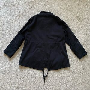 Features: A great fall jacket! It is light weight but fully lined - keeping your warm. There are pockets that close with snaps. The neckline is high but can be turned down. In addition, the waist and bottom/hip can be cinched in, using the pulls enclosed.