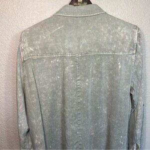 Molly & Isadora Button Up Acid Wash Shirt. Button down closure, sleeves can be rolled up. Slit in back for great fit, soft and comfortable. Size 1X. Color Stone Sage.