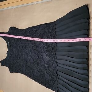 Molly Malloy Evening, Size 6 Vintage Black Lace Overlay Cocktail Evening Dress.  Gorgeous Sleeveless Sheath Silhouette with Black Lace.  Lower Portion is Solid Black Pleated.  Back Zipper Closure.  Excellent Preowned Condition, No Holes, Rips, Stains or Snags.  Please refer to measurements in photos to ensure proper fit.  Shown on size 4-6 mannequin.