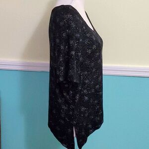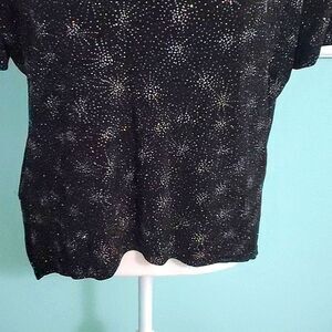 Black rainbow fireworks sparkly top. Scoop neck. Structured shoulder pads. Side slits. 92% acetate and 8% spandex.
