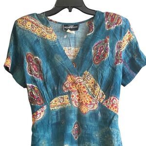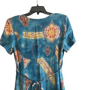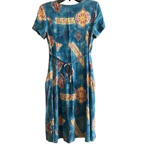 Gorgeous all season short sleeve dresss featuring a surplice v-neckline. A-line silhouette, back zipper closure and behind the back tie. Excellent condition. Great 90’a throw back.