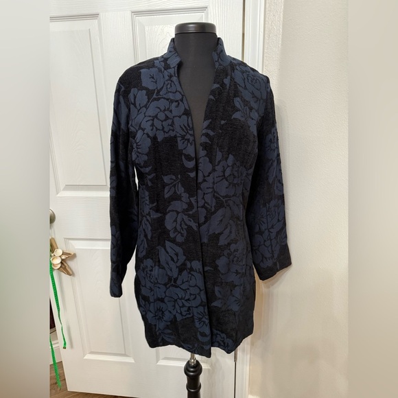 Molly & Maxx Petite Floral Brocade Coat Blue Black textured size Large NWT