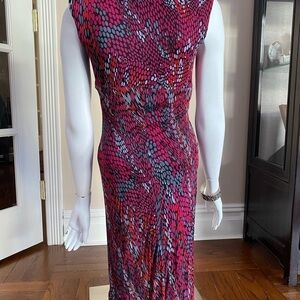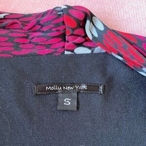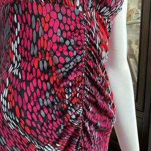 Molly New York pretty sheath dress, formfitting, stretchy, red burgundy and gray dot pattern with draping down the front and a deep V-neck. The tag is cut out but I would say it’s a polyester blend. In excellent preowned condition with no signs of wear.