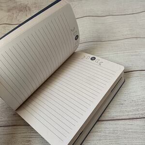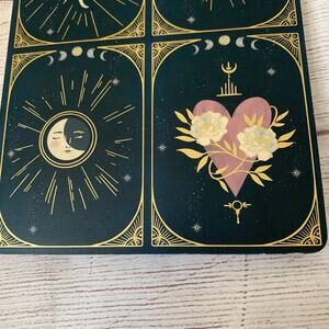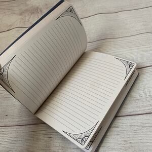 Navy and shimmery gold journal with a snake, sun, moon, heart, and more by Molly & Rex. This journal has a navy blue cover with a shimmery metallic-like gold design. There are touches of cream, grey, and pink in the design. The spine of the journal is gold. The front has 4 small designs that are framed and have the phases of the moon, including a snake, sun, moon, and heart. The back of the cover has 4 different designs. There are 208 lined pages in the journal with 4 different designs. The designs include draped dangling stars and moons, 4 framed corners, Stars and moons and stars in the corners, and the phases of the moon at the top. It is NEW, never used.
