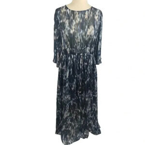 GUC: Molly Bracken Premiu Spacedye Print Sheer Maxi Dress. Colors: Blue, Cream, White, and Metallic. 3/4 Sleeves