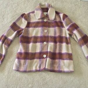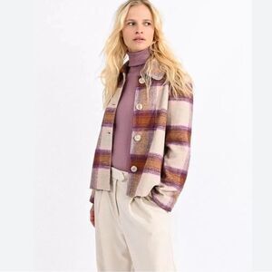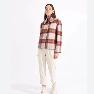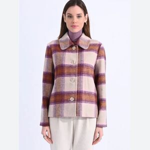 This Molly Bracken coat combines a classic plaid pattern with a modern, tailored fit. The rich blend of purple and tan hues adds a sophisticated touch, making it a versatile addition to your wardrobe. Perfect for cooler weather, this blazer offers both style and warmth.
