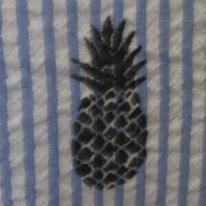 Molokai Mens S/S Blue Cotton Seersucker Button-down Casual Shirt. Size XL Short. Armpit-to-armpit 25", Length 27". Cotton/Polyester w/Pineapples over Blue/White Pinstripe Seersucker.