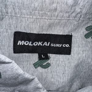 The Molokai Surf Co. Men's Grey Cactus Short Sleeve Shirt in size L features a graphic cactus print, button closure, and a collared neckline. Made from a woven fabric in a classic fit, this casual button-up shirt is machine washable for easy care. Perfect for adding a touch of style with a desert-inspired theme to your wardrobe.