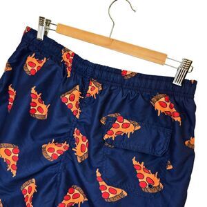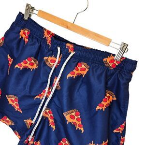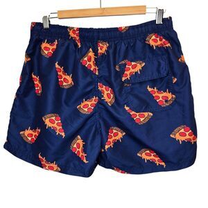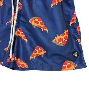 Molokai Surf Co Men's M Blue Pizza Print Swim Shorts Trunks. Dive into fun with these stylish blue swim shorts featuring a playful pizza print. Perfect for beach days or poolside lounging. Net lining inside. Has net pockets on sides and 1 back flap velcro pocket. Color is navy blue with pizza print. 100% polyester.