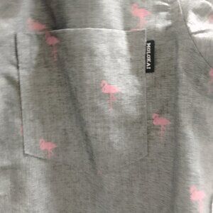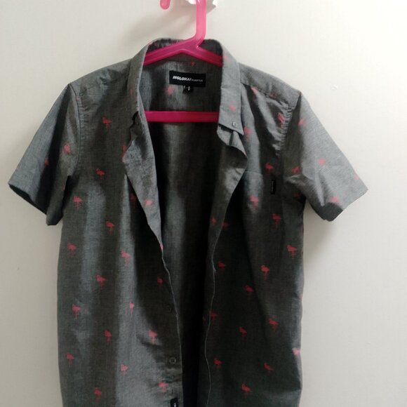 Older Boys/Smaller Man's, Flamingo, Short Sleeved, Buttoned, Top. Brand: Molokai Surf Co. Color: Gray/Pink. Size: Small/8. Material: 55% Cotton, 45% Polyester. Made in China. Has a pocket on the left front of the top and has flamingos on the top. Condition: Preowned, has no stains, no tears, no rips, no damage. Comes from a smoke free home. Thanks for watching!