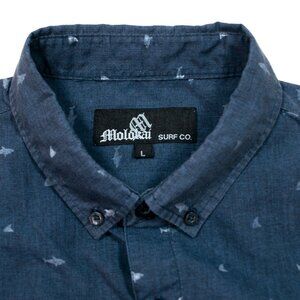 Shark print button down shirt from Molokai Surf Co. in a men's size Large. Blue. Normal wear from gentle use and wash.