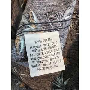 Molokai Surf Co Mens Short Sleeve Button Front Shirt. Black in color with all over print with leaf pattern in brown and aqua blue. One front pocket. 100% Cotton. Machine washable. Made in china. Pit to pit 22.5", back bottom of collar to bottom of shirt 30". great preowned condition with no rips or stains. perfect for the beach vacation hawaiian tropical.