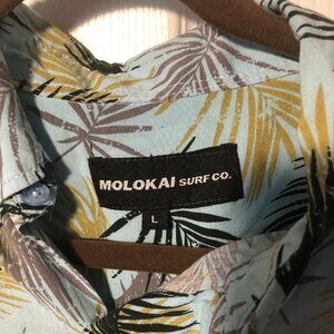 Molokai surf company men greenery in teal print, size L, collar buttons, one chest pocket, 7-button shirt, two spare buttons, 100% rayon, measures approximately when laying flat: shoulder edge to shoulder edge 18", armpit to armpit 21", length at back 31"