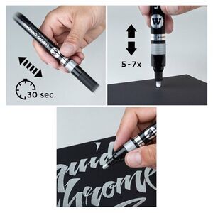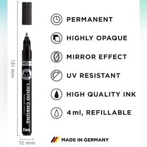 Create dazzling art pieces and illustrations with a Silver Molotow Liquid Chrome Marker. This marker has a highly pigmented ink that creates a mirror effect on non-porous surfaces and a metallic effect on porous surfaces. It dries to be permanent, has a low odor, and has good UV resistance. Use it for a shiny effect in custom painting, DIY and hobby projects, or scale modeling. Layer realistic metallic details with this specialty liquid chrome marker.