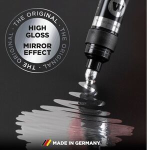 Create dazzling art pieces and illustrations with a Silver Molotow Liquid Chrome Marker. This marker has a highly pigmented ink that creates a mirror effect on non-porous surfaces and a metallic effect on porous surfaces. It dries to be permanent, has a low odor, and has good UV resistance. Use it for a shiny effect in custom painting, DIY and hobby projects, or scale modeling. Layer realistic metallic details with this specialty liquid chrome marker.