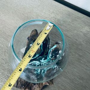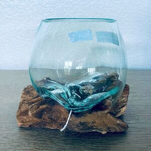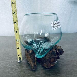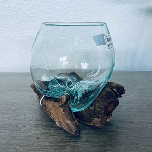 NWT hand blown molten glass bowl or vase on natural wood or driftwood base. Glass piece is a unique one of a kind piece and is an exact matching fit to the curves of the wooden base. Please see photo for size. Can be filled with succulent, plants, rocks, decor, etc and displayed as a a terrarium centerpiece. Fits contemporary modern coastal nautical or beach cottage decor styles.