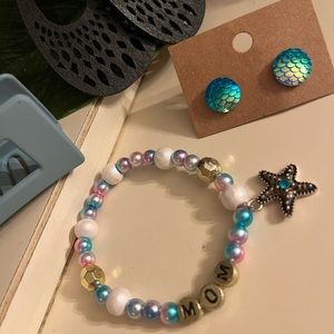 This mom gift set is sea inspired and so cute! Includes a blue hair clip, mom bracelet with adorable starfish charm, blue iridescent mermaid scale earrings, and wooden teardrop earrings with a matching bead.
