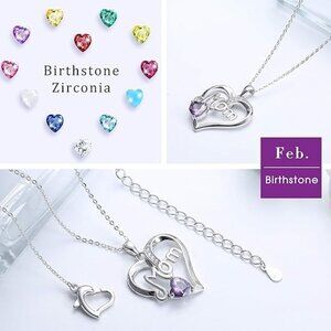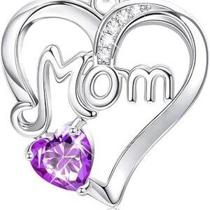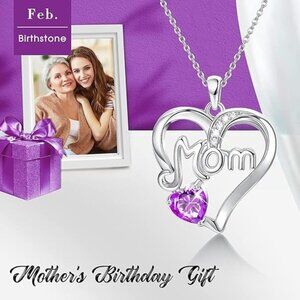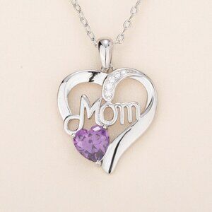 Mom Heart Pendant Necklace, Birthstone, Purple Crystal, February Birthstone