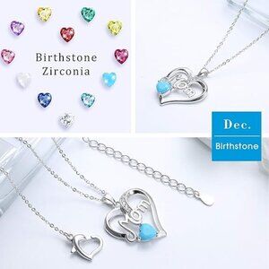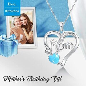 Mom Heart Pendant Necklace, Birthstone Teal Crystal, December Birthstone